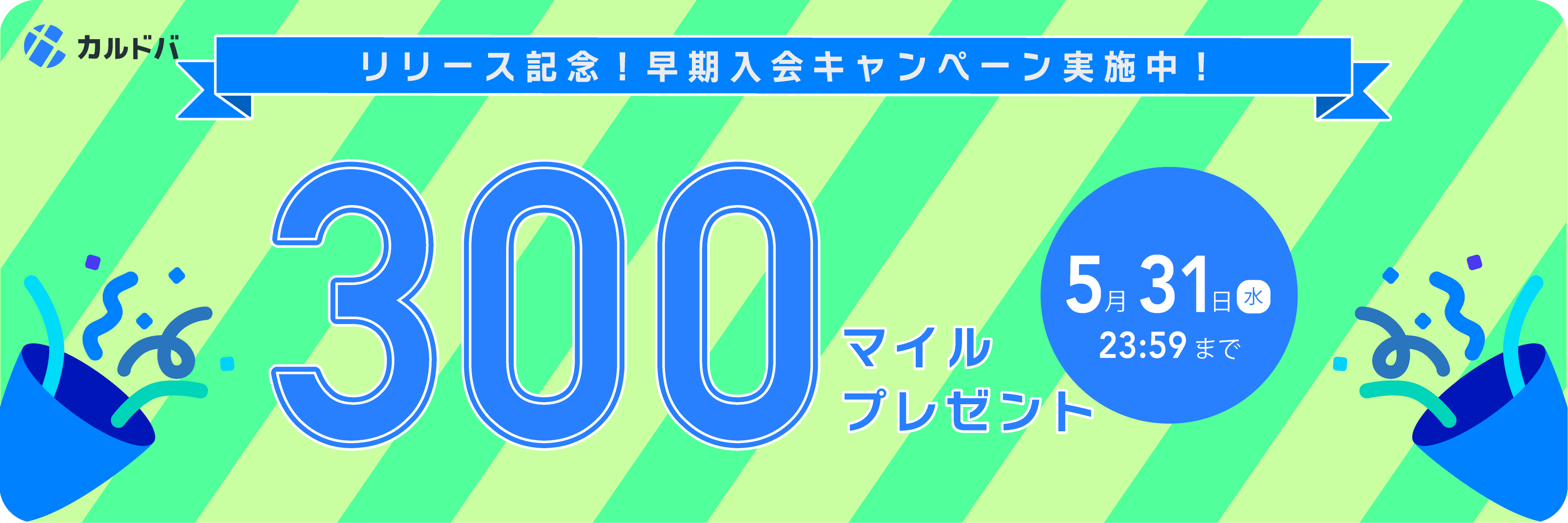 2023年5月31日までにカルドバへ会員登録(本人確認まで)頂くと、300マイルをプレゼントするキャンペーンを実施中。またヴォルト機能のリリースを記念して、2023年6月30日までにヴォルトを利用していただいた方全員に100マイルをプレゼントするキャンペーンを本日から実施開始。
