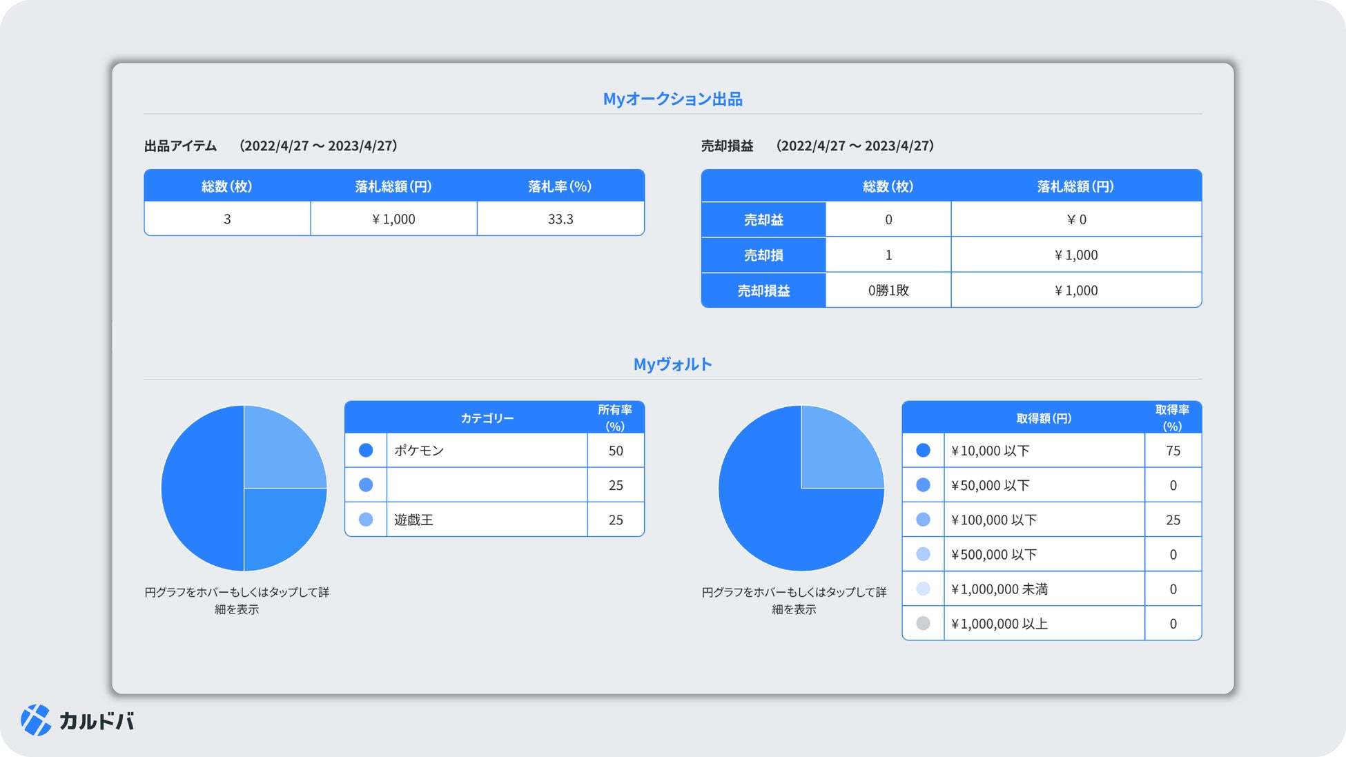 コレクションの総額や、カテゴリー別・金額別の保有比率が一目でわかる「サマリー」では、オークションやトレードの分析項目もご用意。