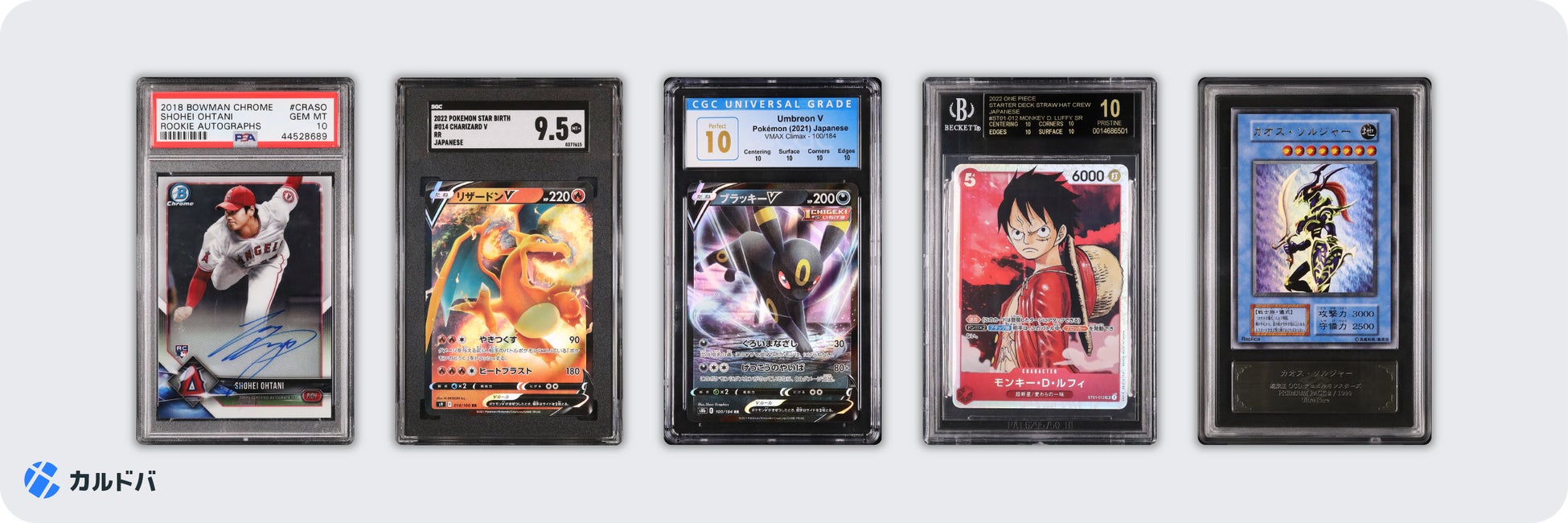 カード鑑定とは、第三者である鑑定会社がカードの状態や真贋の鑑定を行い、専用のケースにいれてカードを保護するサービスです。鑑定されたカードは状態のグレード付けがされ、美しさや状態の良さを客観的に証明された存在となります。鑑定を行っている会社は10社以上存在し、代表的なのは「PSA」「BGS」「CGC」「SGC」「ARS」です。