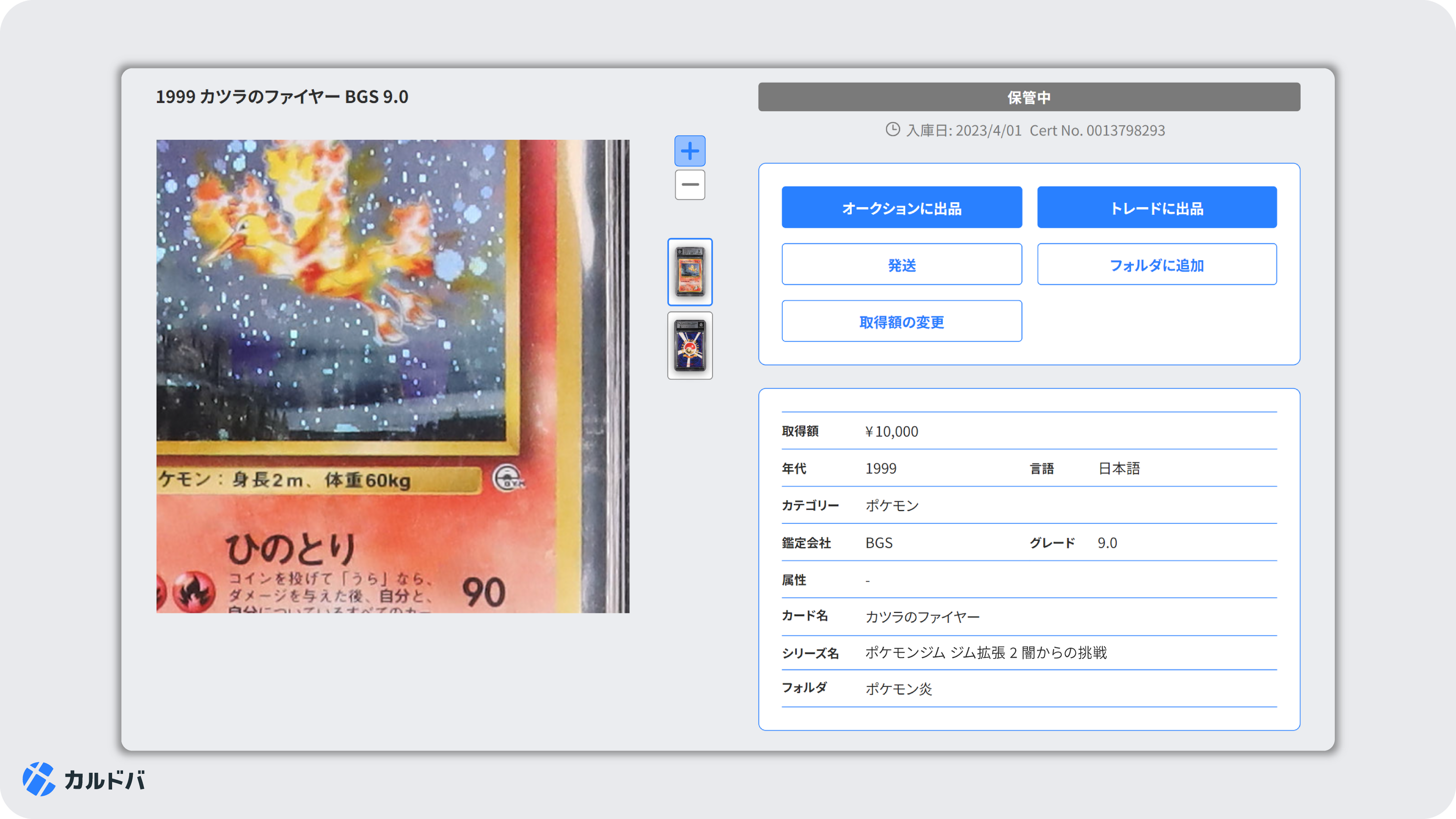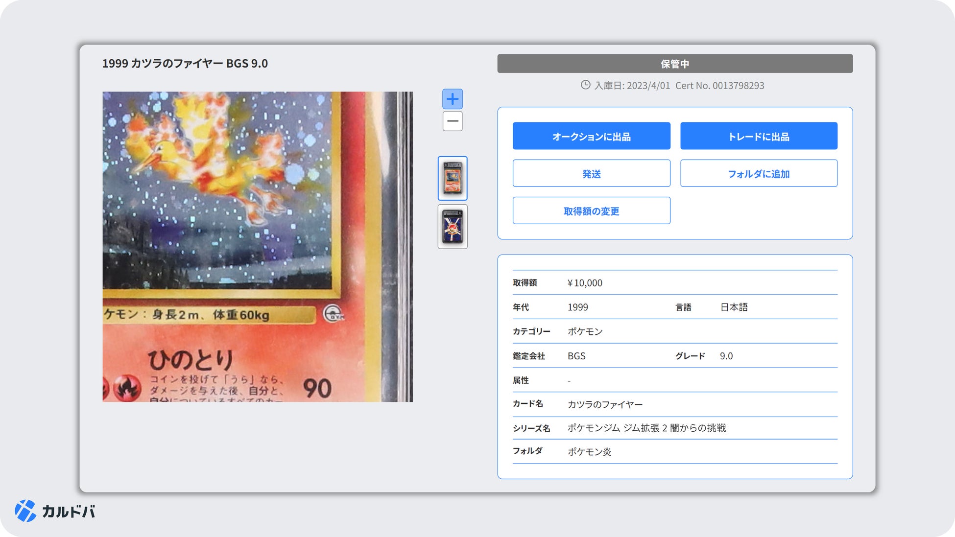 預けたトレカは、カルドバが画像から鑑定情報まで全てデータ化。まるで手元にあるかのような、専門スタッフが撮影した超高画質な画像はホコリひとつ見逃しません。利用者の皆さまはデータ化されたトレカを、スマートフォンや PC でいつでも閲覧・管理できます。