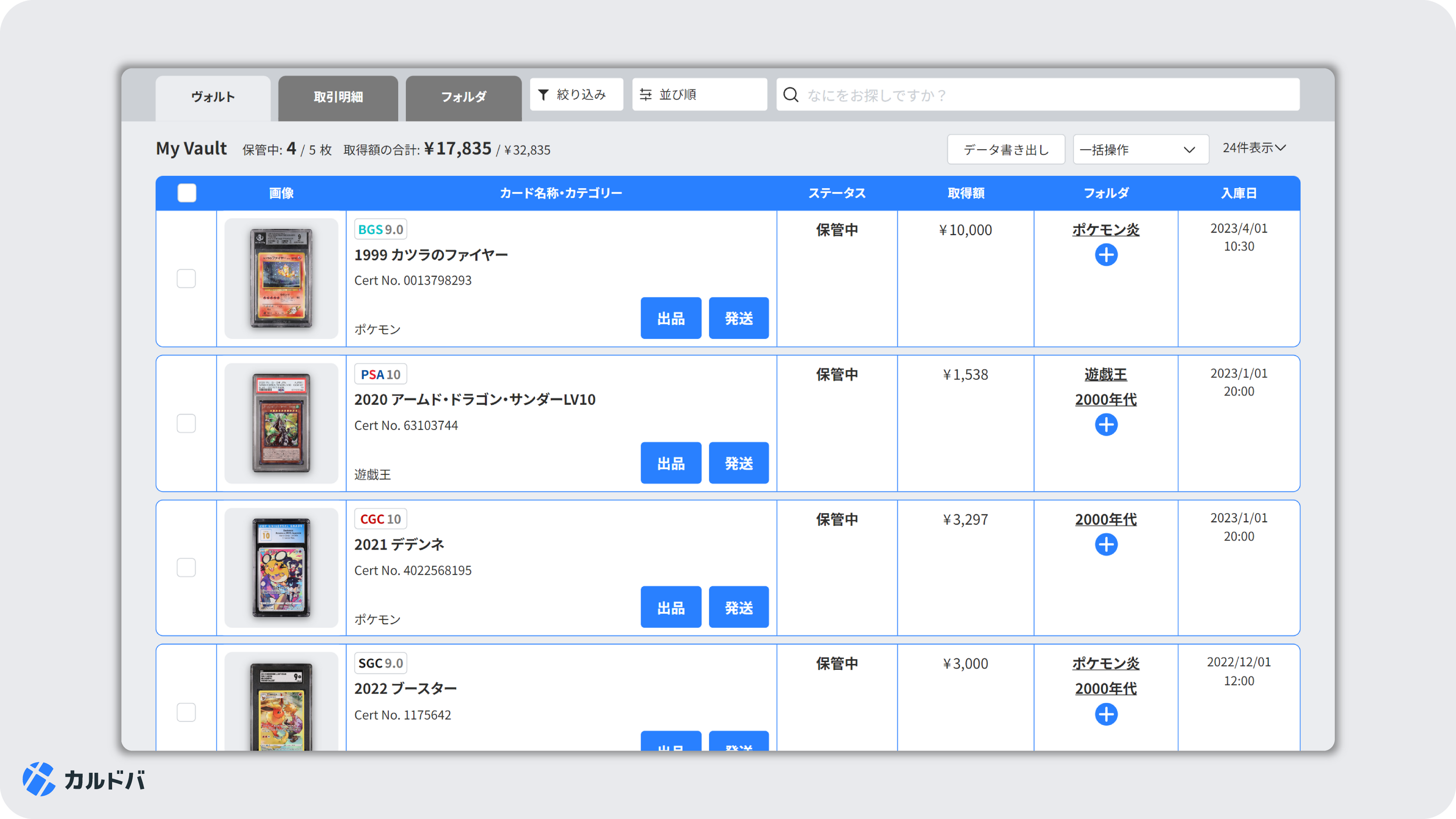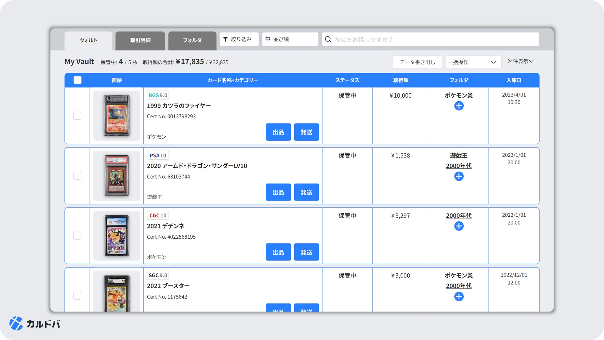 カードの入手日や購入額は、過去の取引も含めてすべて記録。「取引履歴」では、ヴォルトに入ったカード(カルドバへ配送・取引で入手)や、ヴォルトから出て行ったカード(自宅に配送・取引に出品)が一目でわかるので、電子通帳や証券口座のようにトレカを一元管理してみてはいかがでしょうか。
