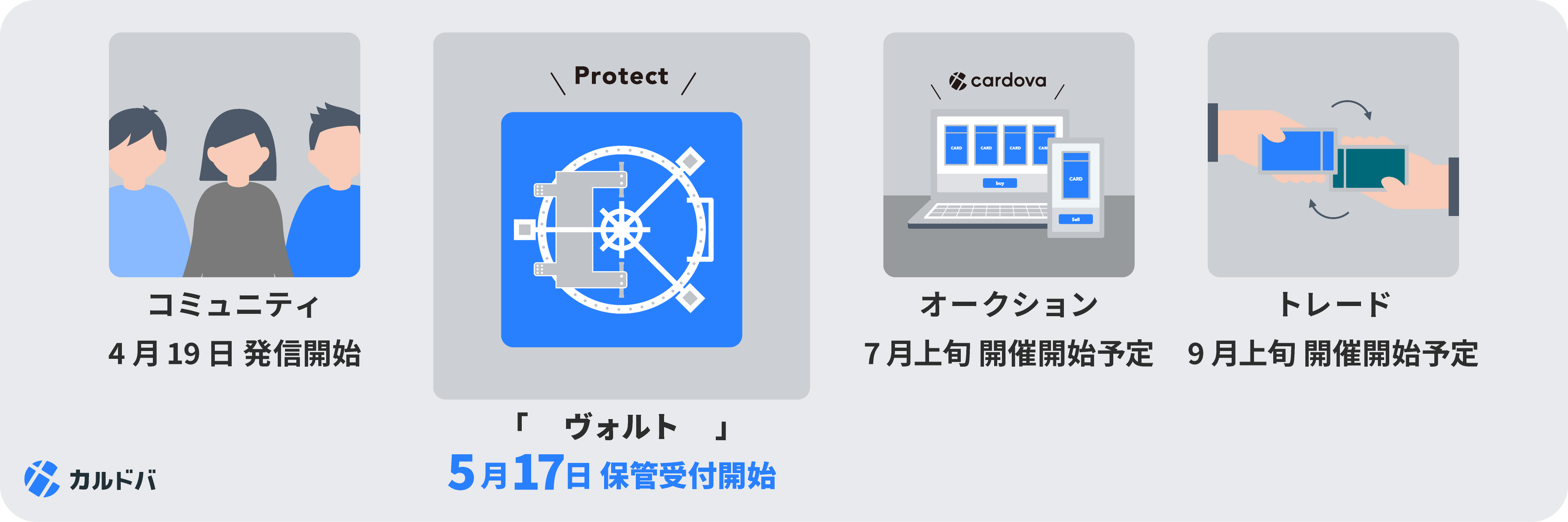 カルドバは、鑑定済みトレカをいつでも何枚でも最適な環境に預けられる「ヴォルト」のほか、自身が保有する鑑定済みトレカをデータ化することによって、より安全・速やかになる「オークション」と「トレード」、トレカ市場のホットトピックが集まり愛好家同士でつながることもできる「コミュニティ」という「4つの機能」を提供してまいります。