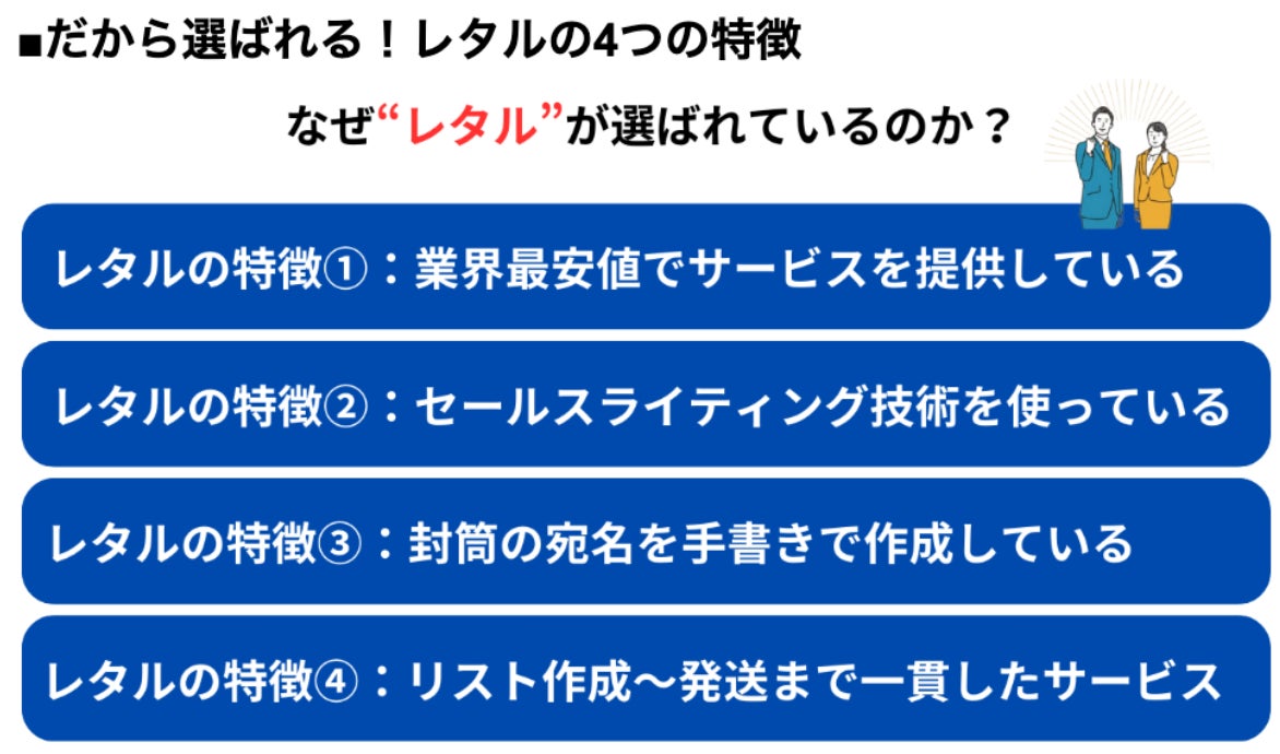 さらに、リスト作成から発送までを一貫したサービスで、業界最安値クラスで提供していることが最大の特徴です。