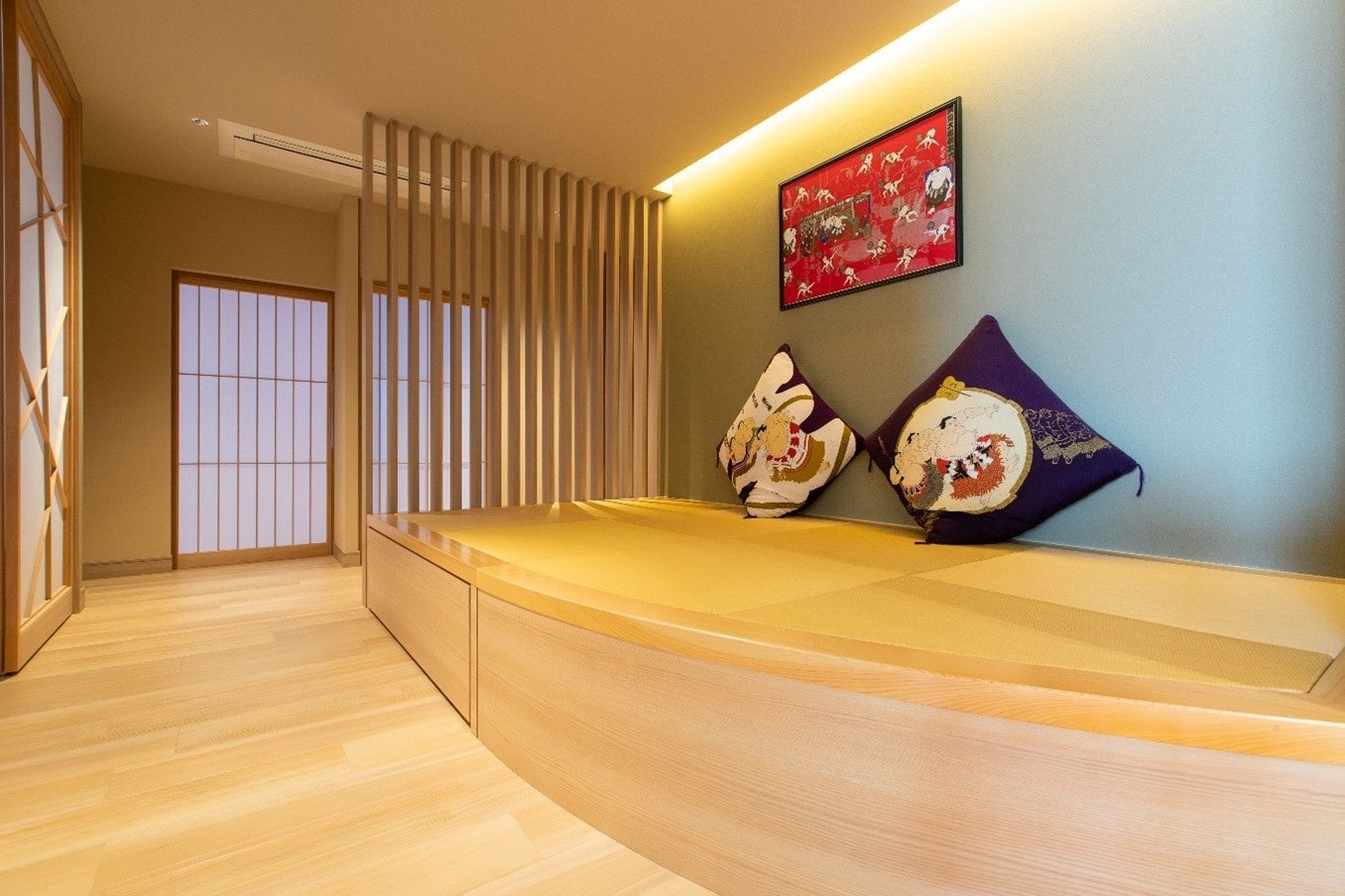 五右衛門風呂風の露天風呂を設けたデラックススイートは、約96平方メートルのゆとりある空間。広々とした客室には、ダイニングスペースのほか畳の和室もあり、都心にいながら旅館に遊びに来た雰囲気をお楽しみいただけます。3世代の家族旅行やグループ旅行、大人数のご宿泊にもぴったりな客室です。