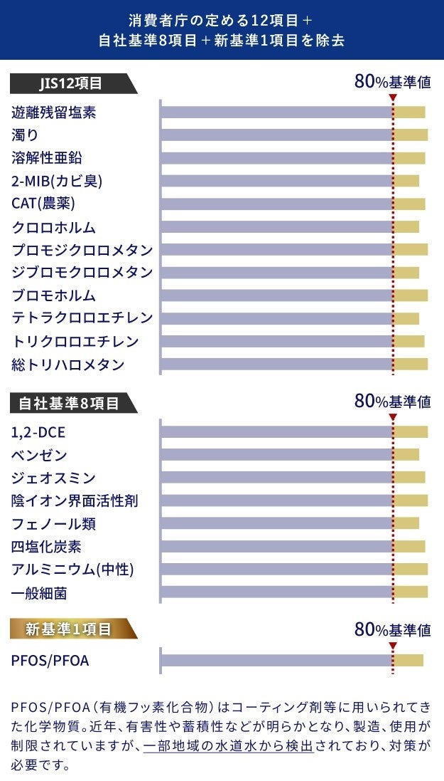 当社では日々商品の改良、改善に取り組んでおり、近年話題にもあがる有機フッ素化合物(PFOS/PFOA)を新浄水項目としてJIS S 3201:2019家庭用浄水器試験方法のろ過能力試験の方法を参考とした試験を実施。有機フッ素化合物(PFOS/PFOA)の除去が認められました。