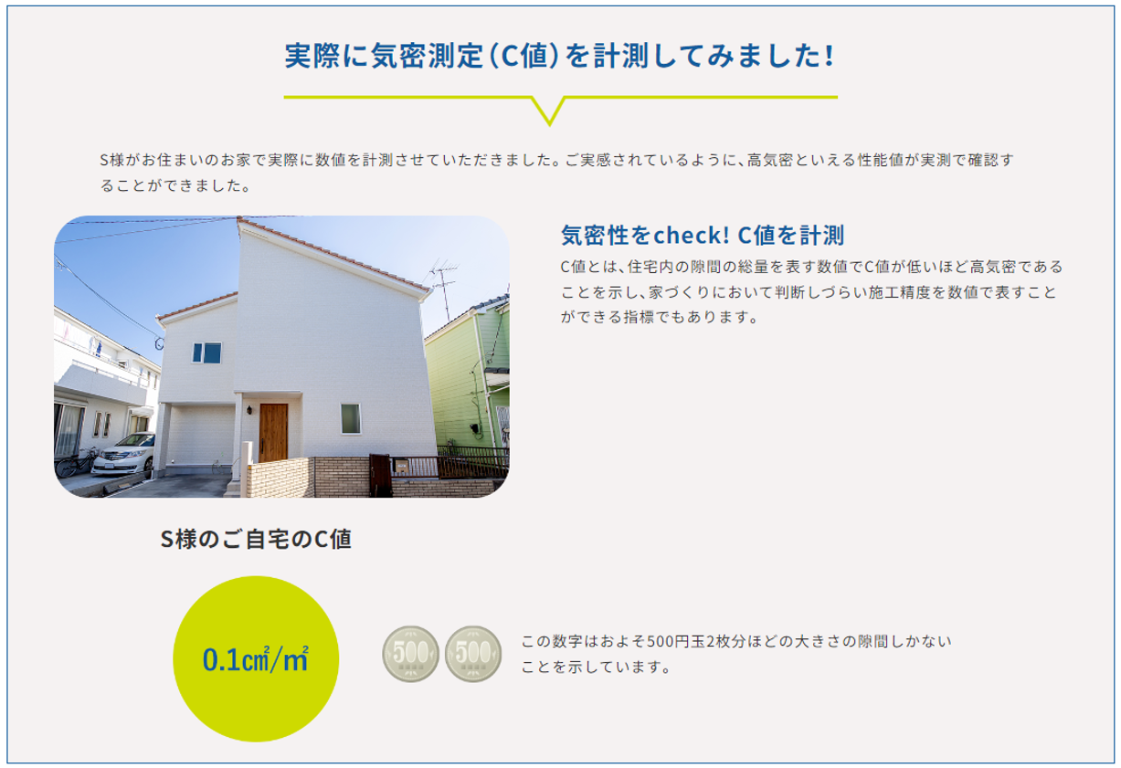 ソーラーサーキットが大切にしている実測値。気密性能を表すC値は、シミュレーションでは算出できない数値ですが、家づくりにおいて判断しづらい施工精度を数値で表すことができる大切な指標です。ソーラーサーキットの特徴をご理解しやすいよう、ソーラーサーキットを取り入れた物件での実測値を公表して、高い施工性能による省エネ性の向上をご説明しております。