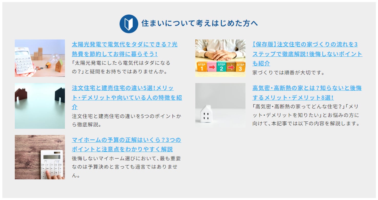 省エネ性の高いお家づくりを検討される際に役立つ「家と暮らしのコラム」を新しく掲載しました。「家探しの知識」「お金のあれこれ」「家を建てるなら」という観点で、定期的にコラム記事を追加していきます。
