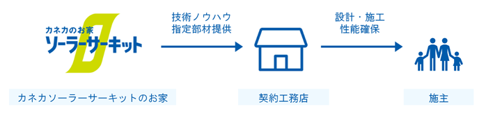 全国のカネカのお家 ソーラーサーキットの契約工務店へソーラーサーキットの技術ノウハウの実施権、およびソーラーサーキットを構成するために必要な指定部材を提供しています。ソーラーサーキットの住宅を建築する際には、各エリアにあるカネカのお家 ソーラーサーキットの契約工務店との建築請負契約による施工が必要になります。