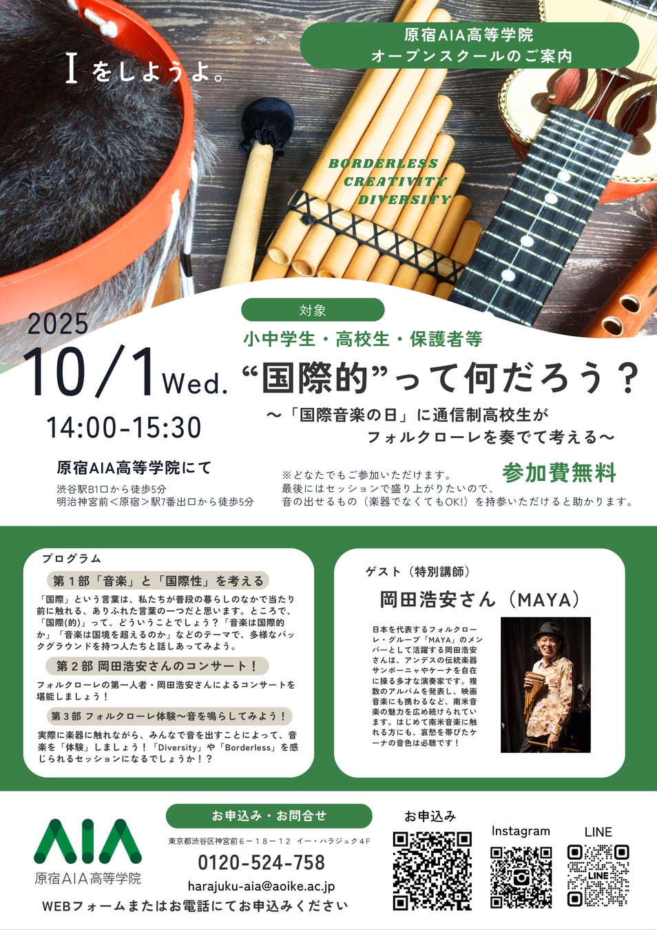 高卒資格の取れるオルタナティブスクール原宿AIA高等学院(以下、原宿AIA)(読み:エーアイエー)では、10月1日「国際音楽の日」に、“国際的”という言葉について考える音楽イベントを開催します。