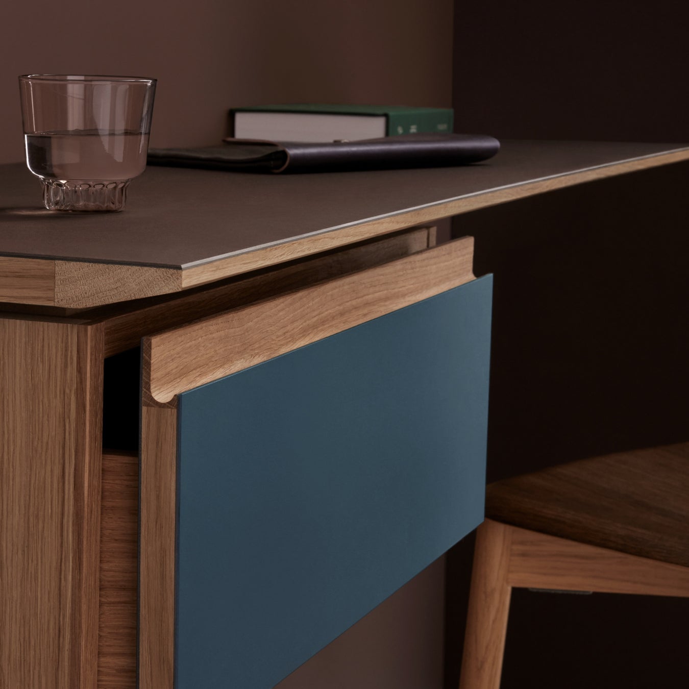デスクやテーブルの天板はもちろん、スツール、棚やキッチンの面材など、あらゆる家具の仕上げに適しています。水平面だけでなく、垂直面や曲面にも使うことができ、創造の幅を広げます。ファニチャーリノリウムは2種類のサイズから選ぶことができ、長尺の5mサイズを用いて継ぎ目のないダイナミックなデザインも可能です。