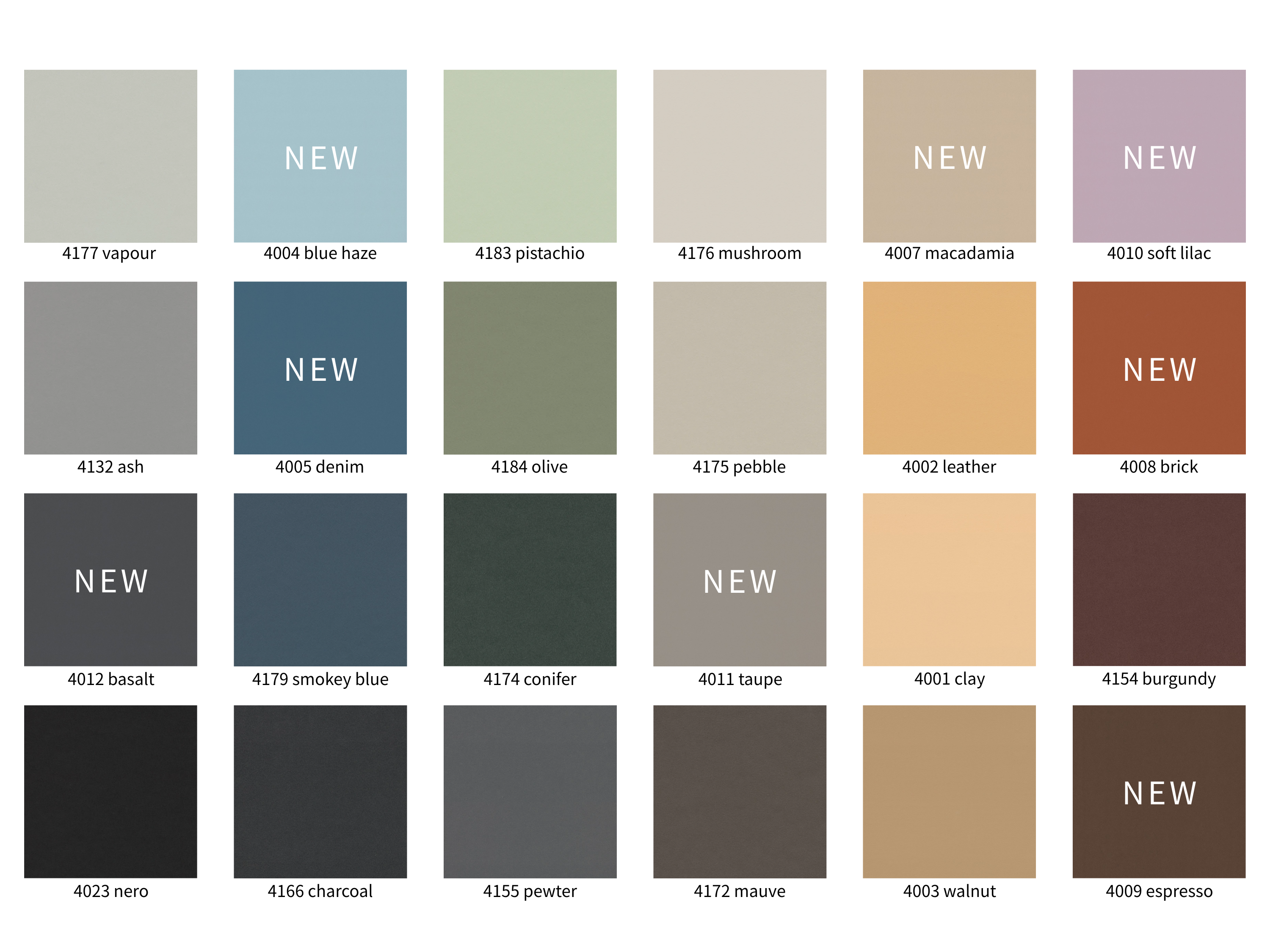 vapour, ash, nero, smokey blue, charcoal, pistachio, olive, conifer, pewter, mushroom,