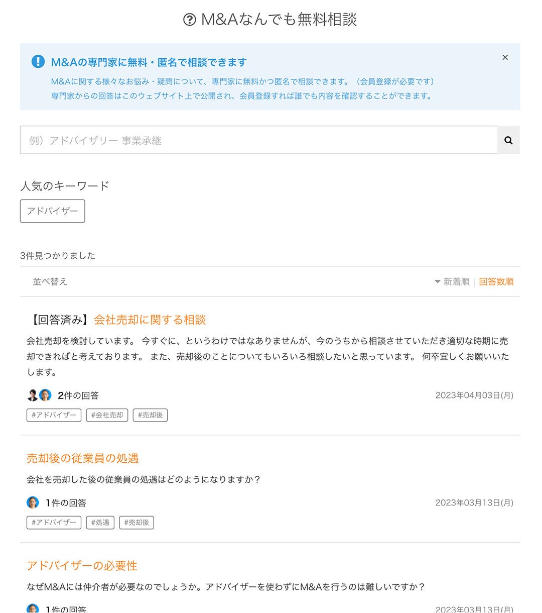 M&A相談ドットコムでは、経営者が専門家への質問を通じて様々な一次情報を得られるだけでなく、中立的な意見が欲しい場合は、弊社代表であるコンシェルジュの野崎への質問を通じて、M&Aに関する知識を深めることができます。