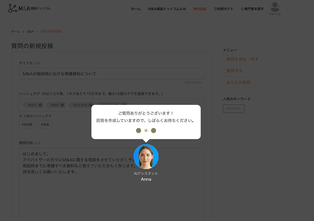SaaSとAIを活用したM&A専門家とユーザーをつなぐ「M&A相談ドットコム」を開設。ChatGPT APIによる即時回答にも対応