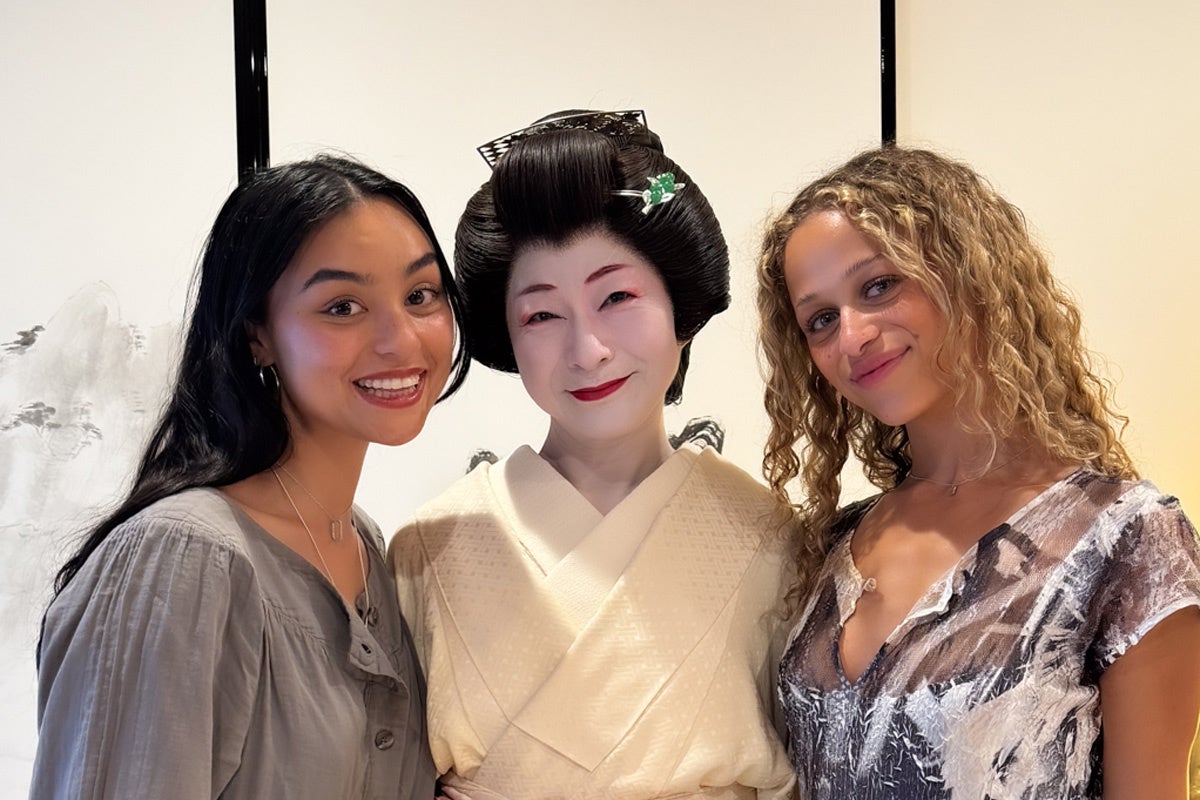 小さな本格檜舞台を備える広間で芸者が「お座敷」の楽しみを案内します。