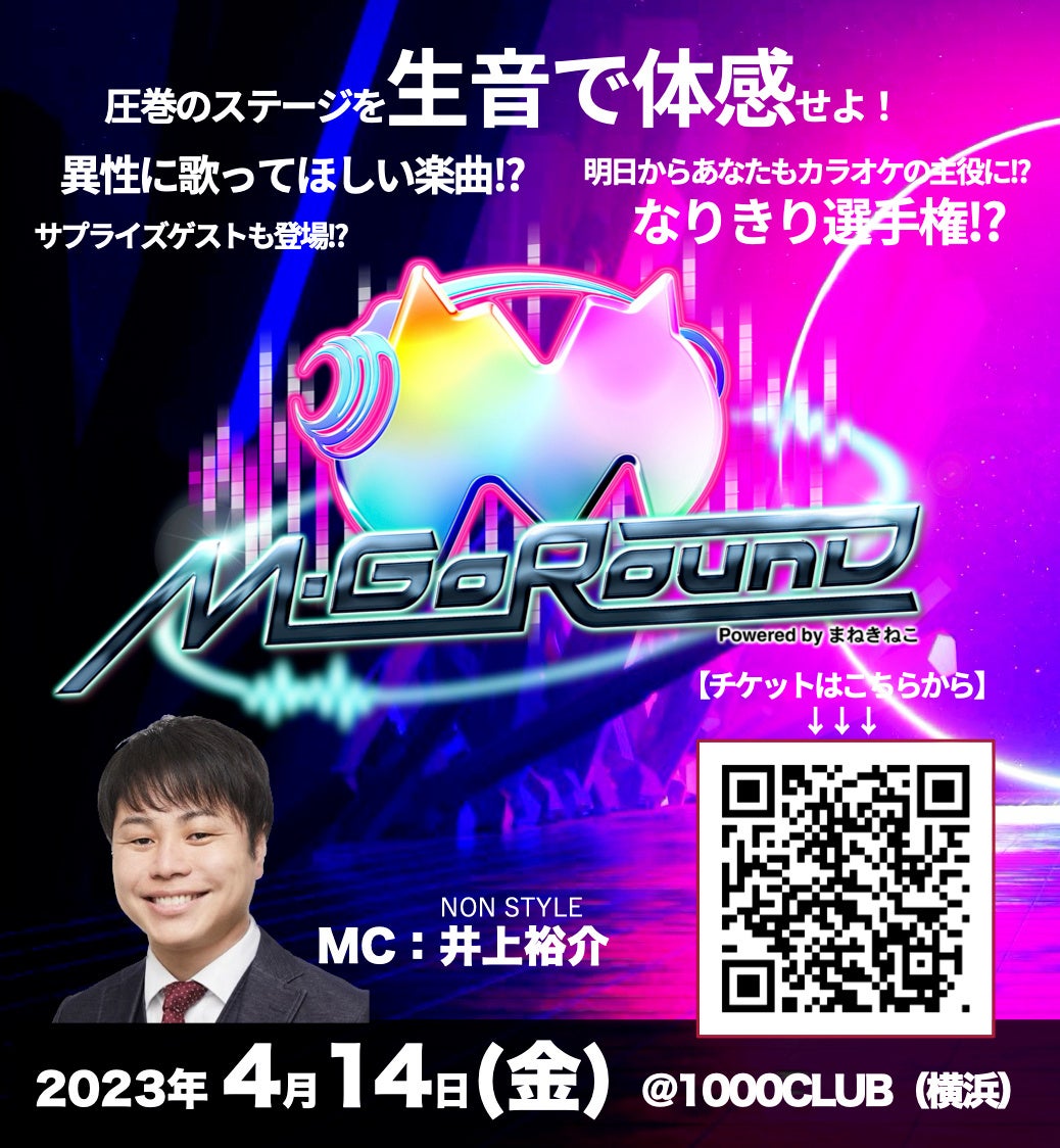 新感覚!⾳楽バラエティーFes. 『M-Go Round Powered by まねきねこ』が発動!2023年4⽉14⽇(⾦)@1000CLUB(横浜市⻄区)開催決定、イープラスにてチケット絶賛発売中