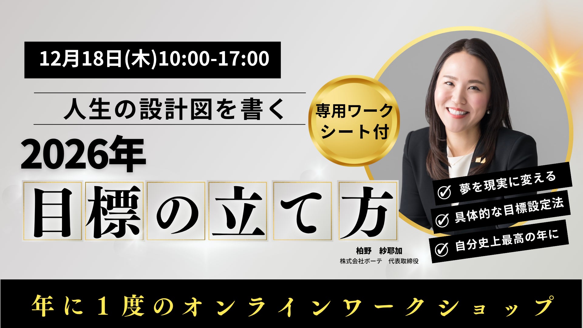Forbes JAPAN WOMEN AWARD 2025で第4位を受賞した、株式会社ボーテ(本社:大阪市)代表・柏野紗耶加氏が、"目の前の仕事だけでなく、人生そのものを設計する力"を一般向けに大公開。2026年を"飛躍の1年"に変える目標設定とキャリアデザインを両立させる「ライフキャリア設計法」を学ぶ、年末特別オンラインワークショップを開催いたします。