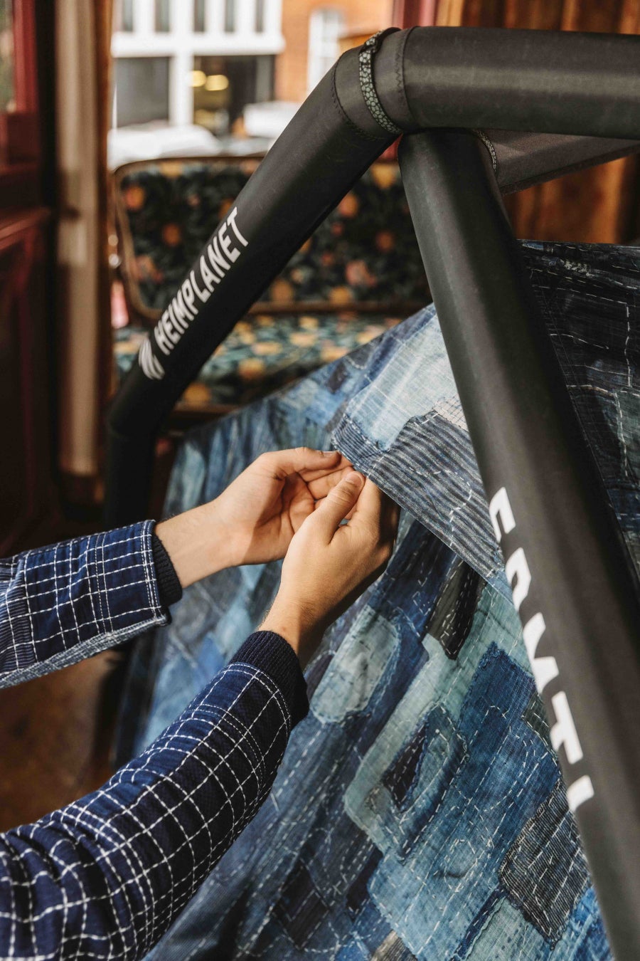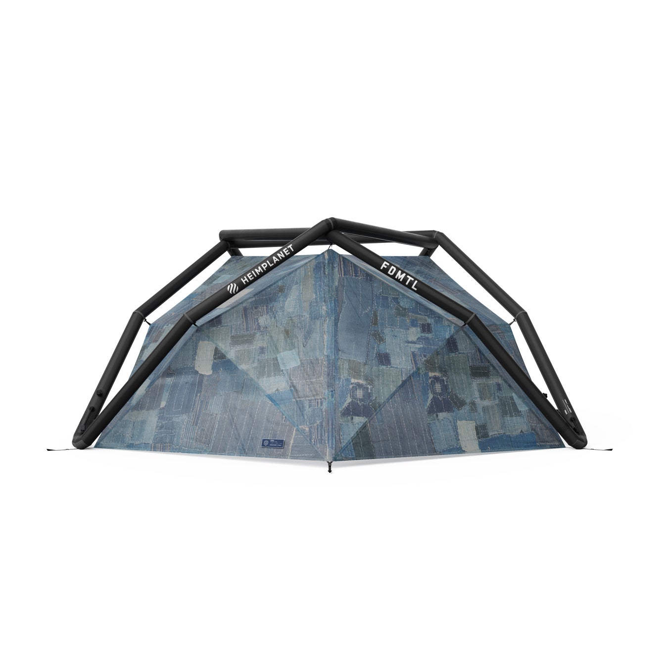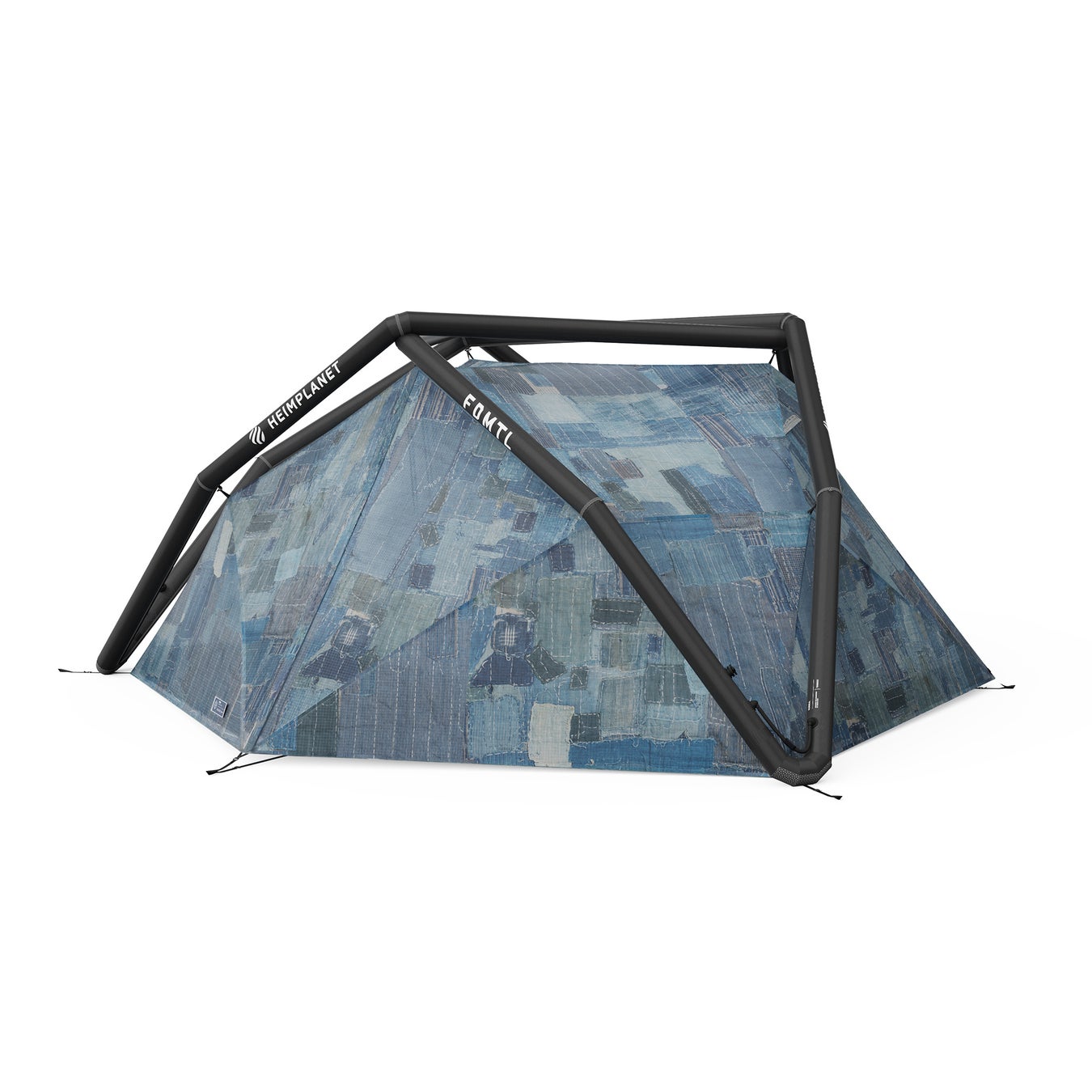 今コラボレーションはデザイナー津吉氏がHEIMPLANETの代表Stefan Claussと時間をかけ作り込んだ製品で、コンセプトはHEIMPLANETが開発した先進的なエアフレームテントの外装に、日本古来のテキスタイルである襤褸(ぼろ)をプリントしたユニークなテントとしてインディゴの経年変化による普遍的な美しさを表現し、アウトドアだけでなくさまざまな環境と調和する独自の存在感を持つように設計されました。