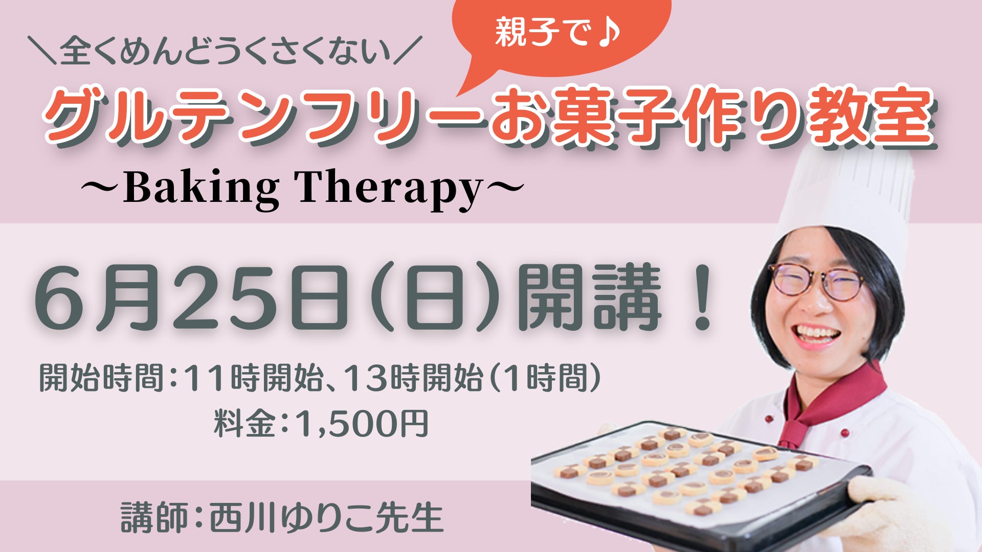 グルテンフリーパティシエの西川ゆりこを講師に迎え、親子コミュニケーションや子どもの主体性・自己肯定感を高めるベイキングセラピープログラムを提供します。アレルギー疾患を有する子どもが増加傾向にあることや、健康志向の高まりから、近年グルテンフリーのお菓子が注目されています。作業工程が多いお菓子作りのイメージを一掃する、とても簡単なグルテンフリーのお菓子作りで、親子コミュニケーションを深められる講座を1回1,500円で提供致します。