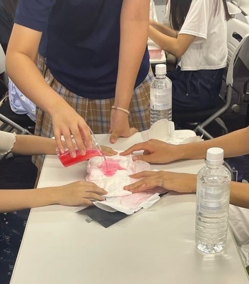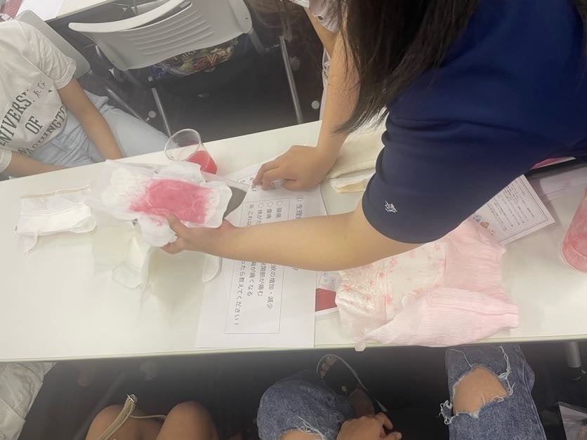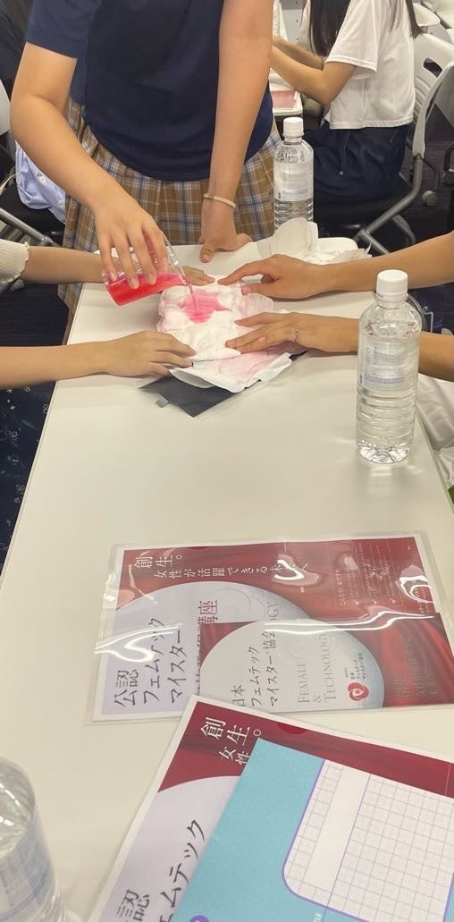 当日は各登壇者の講演をはじめ、品川女子学院 有志団体CLAIR.によるグループワークが最も盛り上がりました。参加者(小学校低学年から中学生、高校生と幅広い年齢の女子が中心)が各6人ずつのグループに分かれて、品川女子学院 有志団体CLAIR.のメンバーが各グループに1名つき、個別にレクチャーの形でグループワークを実施。紙ナプキン、布ナプキンはじめとする生理用品の種類や使い方について、経血に見立てた色付きの水を使いながら、アイテムごとの経血の吸収量の違いや使い方についてその場で見て触れて学ぶ時間となりました。