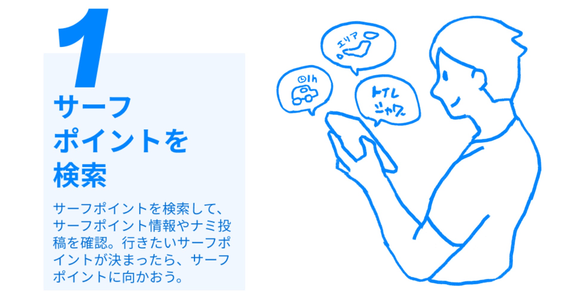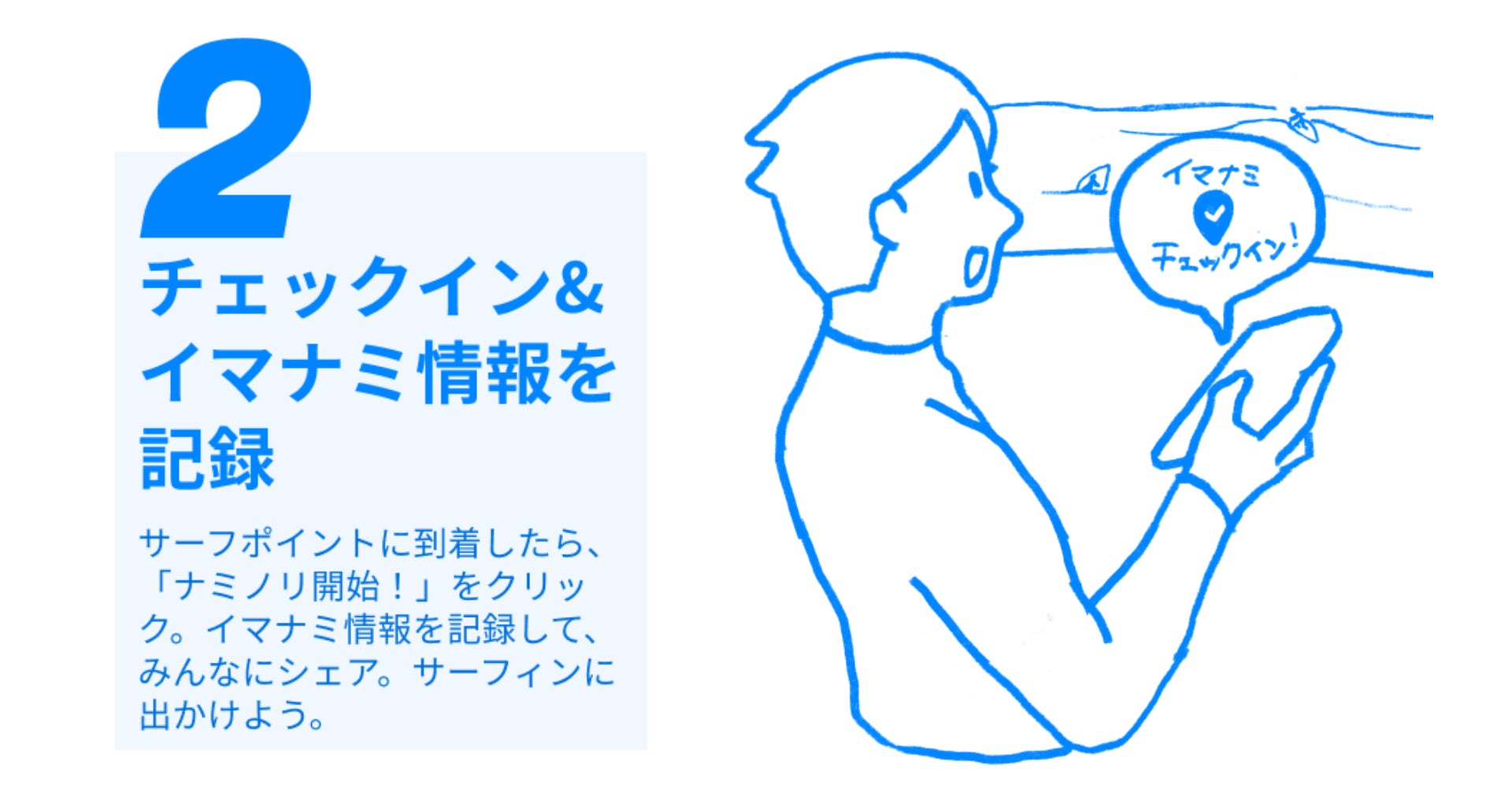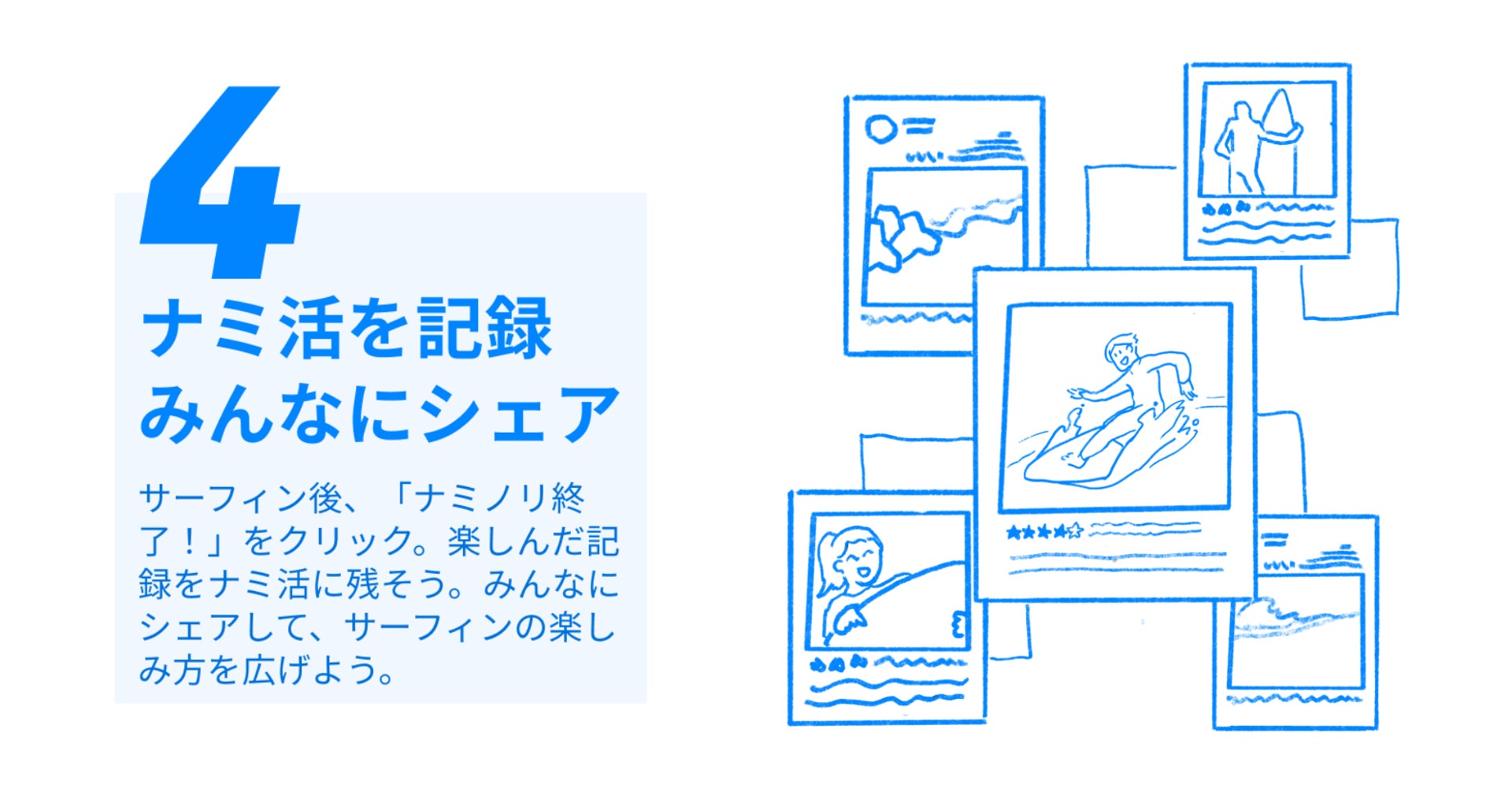 現在の波情報『イマナミ情報』とナミノリを楽しむ活動『ナミ活』を記録し、ナミ投稿として、他のユーザーたちに共有できます。ナミ投稿を通じて、ユーザー同士が繋がることができるため、サーフィンの楽しみ方が広がります。