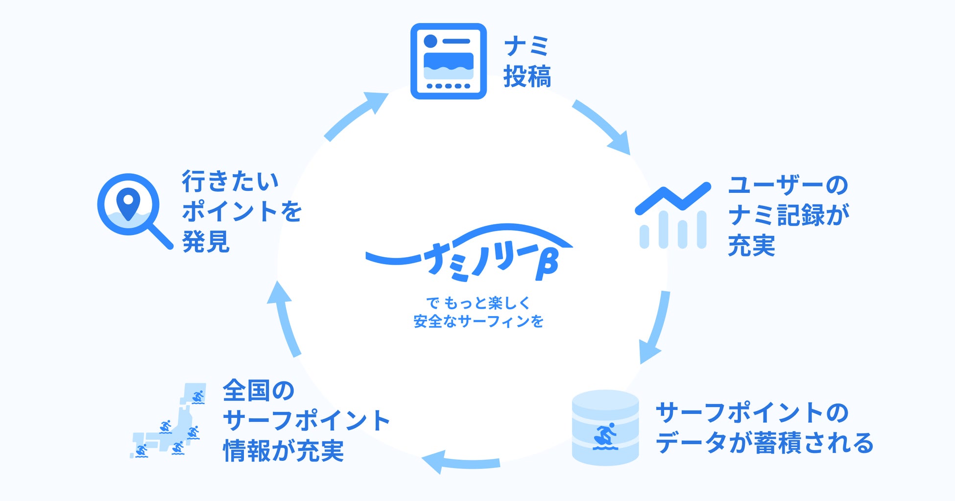 ナミノリーは、「安全に」「もっと楽しく」サーフィンができる環境を提供することを目的としています。各サーフポイントで情報が蓄積されていないため、最新情報(波、設備、駐車場、注意点など)を得られず、ビジターや初心者がトラブルに巻き込まれるケースが多く発生しています。ナミノリー内で各サーフポイントのデータベースを作成することで、サーファーが最新情報を得られる環境を提供し、情報不足という課題を解決することを目指しています。また、データベースから自分の好みのサーフポイントを探すことや、ナミノリを楽しんだ活動を記録として他のユーザーに共有できます。