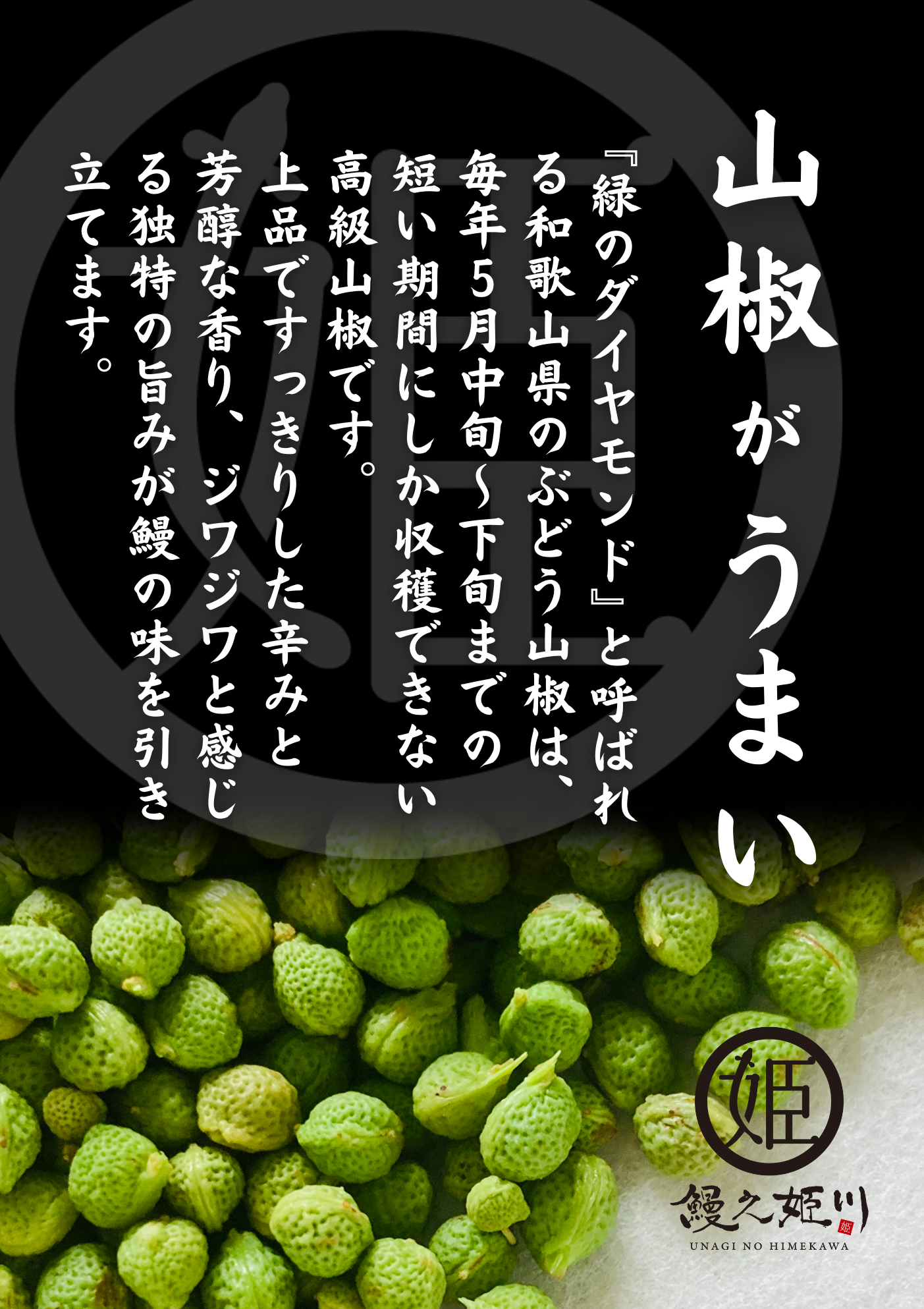緑のダイヤモンドと呼ばれる和歌山県産のぶどう山椒は、毎年5月中旬~下旬までの短い期間にしか収穫できない高級山椒です。上品ですっきりした辛みと、芳醇な香り、ジワジワと感じる独特の旨みが鰻の味を引き立てます。