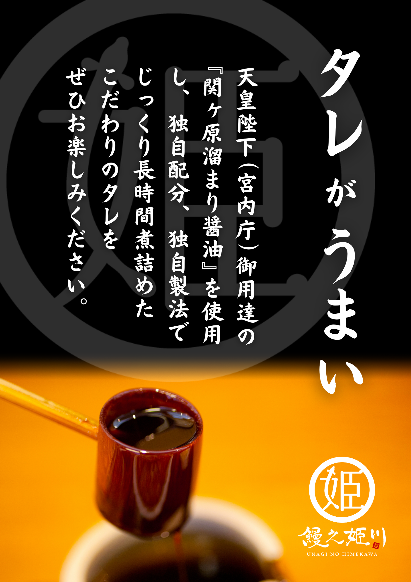 天皇陛下(宮内庁)御用達の関ヶ原溜まり醤油を使用し、独自配分、独自製法でじっくり長時間煮詰めたこだわりのタレを使用しています。