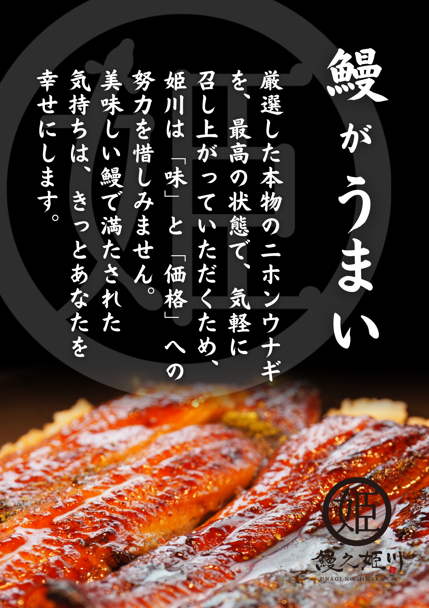 自分の幸せも、周りの幸せも、あなたの満たされた気持ちで大きく変わる。「うなぎ」という食を通じ、幸せが繋がるきっかけになりたい。だからこそ、美味しい鰻をリーズナブルに日常的に食していただきたい。私たちは地域の方々に必要とされる身近な存在でありたいと思っています。