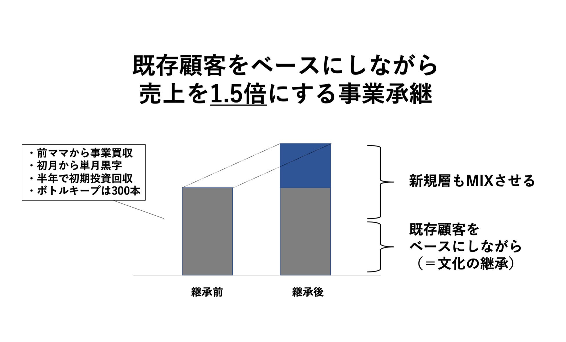 継承店に通っていた既存の顧客をベースにしながら、新規の顧客をミックスさせ、売上を承継前の1.5倍とするモデルで営業しております。承継することで、開店の初期投資を抑え、顧客のベースを作ることができます。さらに、一部スナック業務のDX化・スタッフの教育・新規顧客獲得をして売上向上・利益率向上を行ってきました。