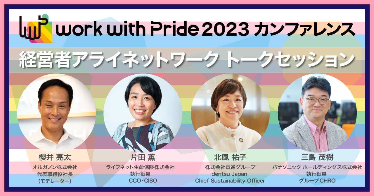 当日は、work with Pride 2023 実行委員会の参画企業20社のうち、18社から集まった20名の経営者を呼びかけ人として企業経営者アライネットワークの設立を発表します。併せて、日本全国の企業経営者にネットワークへの参加を促進するための経済団体からの協力体制についても発表予定です。また、オルガノン株式会社の代表取締役社長の櫻井 亮太氏をモデレーターに、下記の経営者陣と立ち上げ記念パネルトークを実施します。