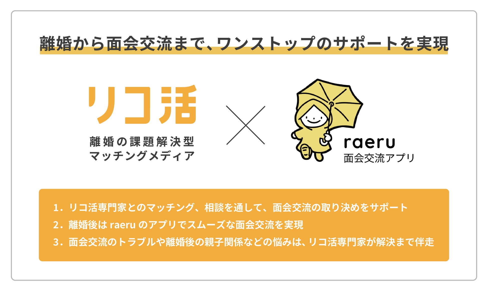 離婚や夫婦問題に実績を持つ専門家とのマッチングメディア「リコ活」と、面会交流の調整が簡単に行えるアプリ「raeru」の協業により、これらの問題の解決を目指します。