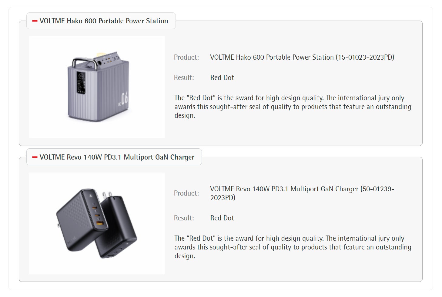 モバイル電源ソリューションの大手プロバイダーである株式会社Voltnex Innovations Technologyは、同社の Hako 600 ポータブル電源と Revo 140 PD3.1 GaN高速充電器が権威ある2023レッド・ドット・デザイン賞を受賞しました。