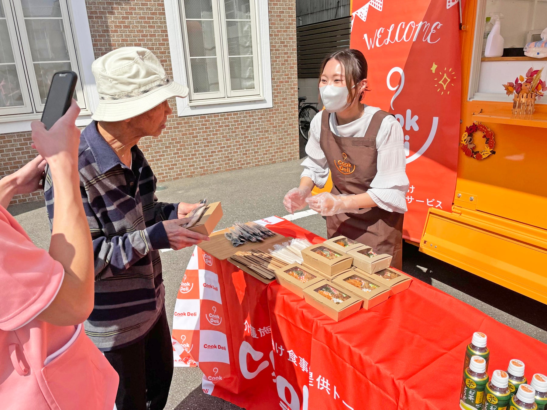 「Deli cafe」は、営業や開発担当者など全社員が携わり、持ち回りで運営をおこなっています。メニューは、献立の新メニューやオリジナルメニューをお弁当箱に詰めたり、お皿に盛りつけて提供しています。入居者は施設を出てキッチンカーまで来てもらい、社員から入居者一人ひとりに手渡ししていきます。天気が良ければ食事を外でおこなうことができ、ちょっとしたピクニック気分も楽しめます。