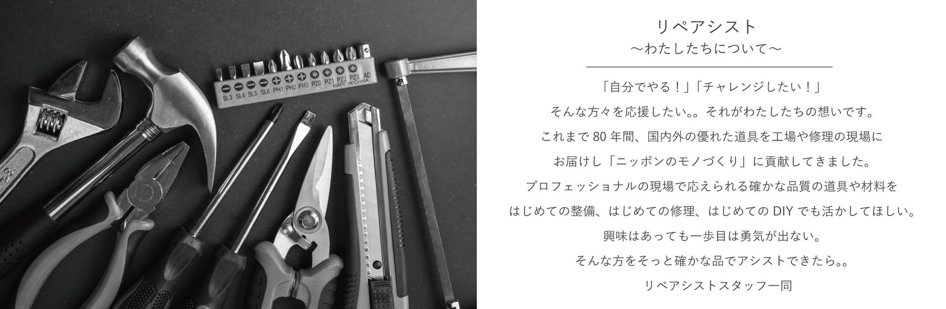 これまで、国内外の優れた工具を工場や修理現場に提供し、「ニッポンのモノづくり」に貢献してきた私たちは、プロフェッショナルが信頼する道具と情報を、初めての整備や修理にチャレンジする自動車・バイクメンテナンス初心者にも安心して利用していただきたいという想いからリペアシストを開設しました。