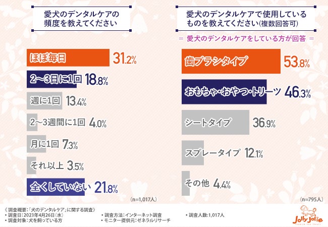 そこで今回、ペット向けジビエトリーツブランド『Jolly Jolie』(https://www.globalpetbrands.co.jp/jolly-jolly/)を手掛けるグローバルペットブランズジャパン株式会社は、犬を飼っている方を対象に、「犬のデンタルケア」に関する調査を実施しました。