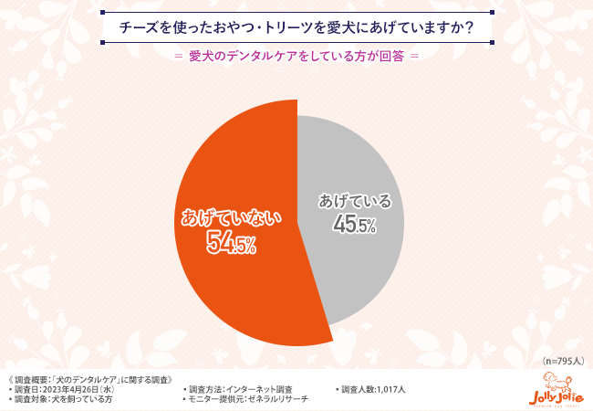 そこで、「チーズを使ったおやつ・トリーツを愛犬にあげていますか?」と質問したところ、『あげている(45.5%)』『あげていない(54.5%)』という回答結果になりました。