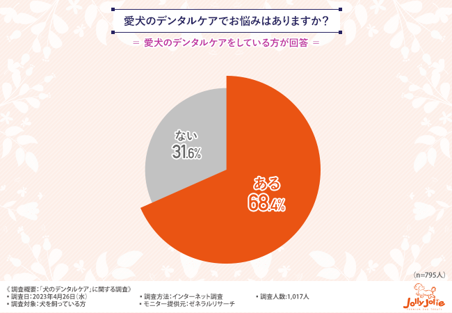 「愛犬のデンタルケアでお悩みはありますか?」と質問したところ、6割以上の方が『ある(68.4%)』と回答しました。