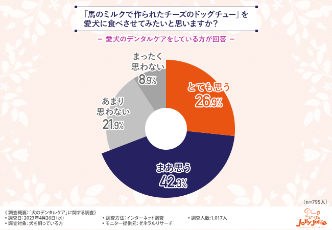 「馬のミルクで作られたチーズのドッグチュー」を愛犬に食べさせてみたいと思いますか?」と質問したところ、『とても思う(26.9%)』『まあ思う(42.3%)』『あまり思わない(21.9%)』『まったく思わない(8.9%)』という回答結果になりました。