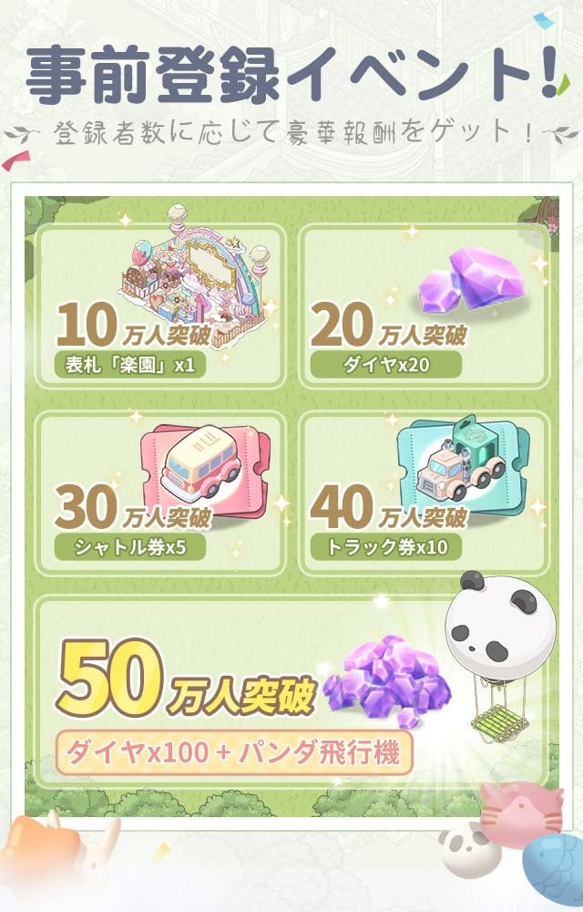 現在事前登録受付の開始にあわせたキャンペーンも実施、50万人の事前登録者達成で、すべてのプレイヤーに「ダイヤ×100+パンダ飛行機」が配布されるなど、事前登録者数に応じた特典が用意されている。