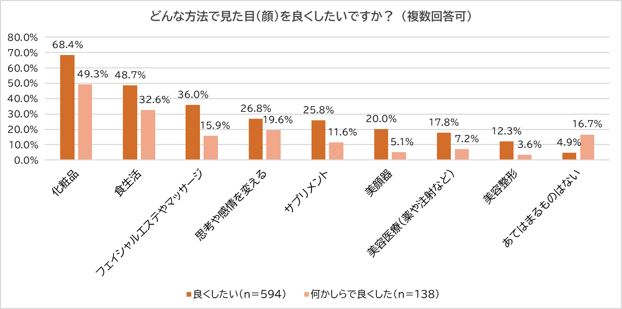 「良くしたい」「何かしらで良くした」と回答した人それぞれに「どんな方法で見た目(顔)を良くしたいか?」尋ねました。どちらも最多は「化粧品」(良くしたい:68.4%、良くしたい:49.3%)、続いて「食生活」(良くしたい:48.7%、良くした:32.6%)となりましたが、それ以下、良くしたい人は「フェイシャルエステやマッサージ」(良くしたい:36.0%、良くした:15.9%)、良くした人は「思考や感情を変える」(良くしたい:26.8%、良くした:19.6%)と分かれました。