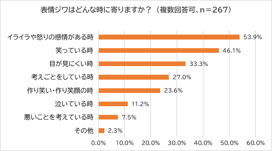 「表情ジワ」と回答した人に「そのシワはどんな時に寄るか?」尋ねました。半数以上(53.9%)が「イライラや怒りの感情がある時」といったマイナスな感情が出ている時が最多だった一方、「笑っている時」というプラスの感情が出ている時も5割弱(46.1%)いました。また、「目が見にくい時」といった物理的な表情をしている時も3割超(33.3%)いました。