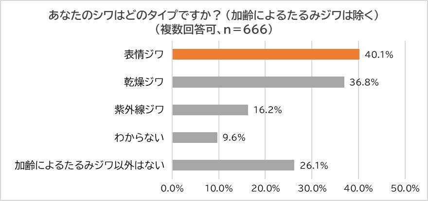 続いて、「顔のシワが気になる」と回答した人に「そのシワのタイプ(加齢によるたるみジワは除く)」を尋ねまたところ、「表情ジワ(40.1%)が最多、以下「乾燥ジワ」(36.8%)、「紫外線ジワ」(16.2%)と続きました。