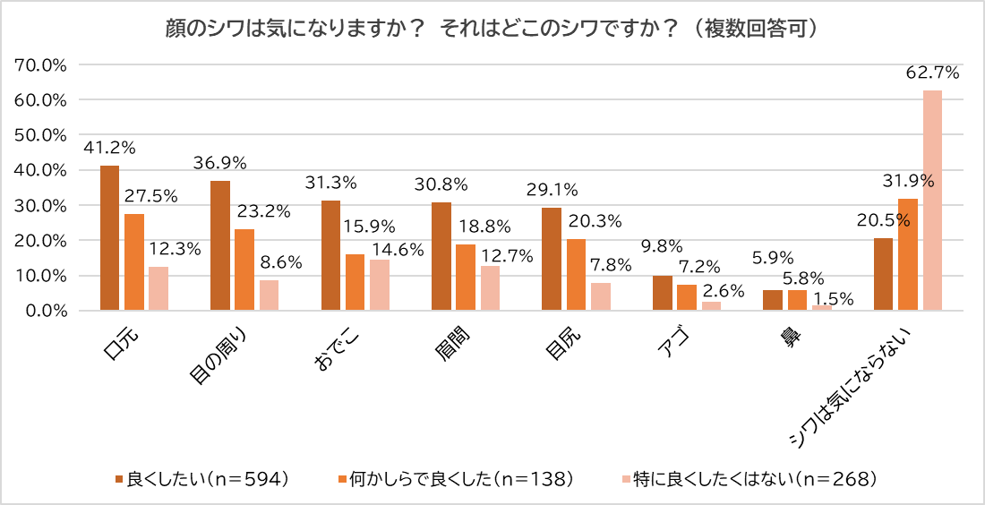 今度は、「どこのシワは気になるか?」尋ねました。良くしたい人の最多が「口元」(良くしたい:41.2%、良くした:27.5%、良くしたくはない:12.3%)だったのに対し、良くした人と良くしたくはない人の最多は「シワは気にならない」(良くしたい:20.5%、良くした:31.9%、良くしたくはない:62.7%)となりました。