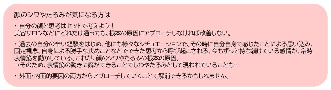 そこで、見た目を変えるには、どのように根本を変えていく必要があるのか、またなぜそこにシワができるのかをお伝えします。気になるシワがある方は、ご自身の感情と照らし合わせてみてください。