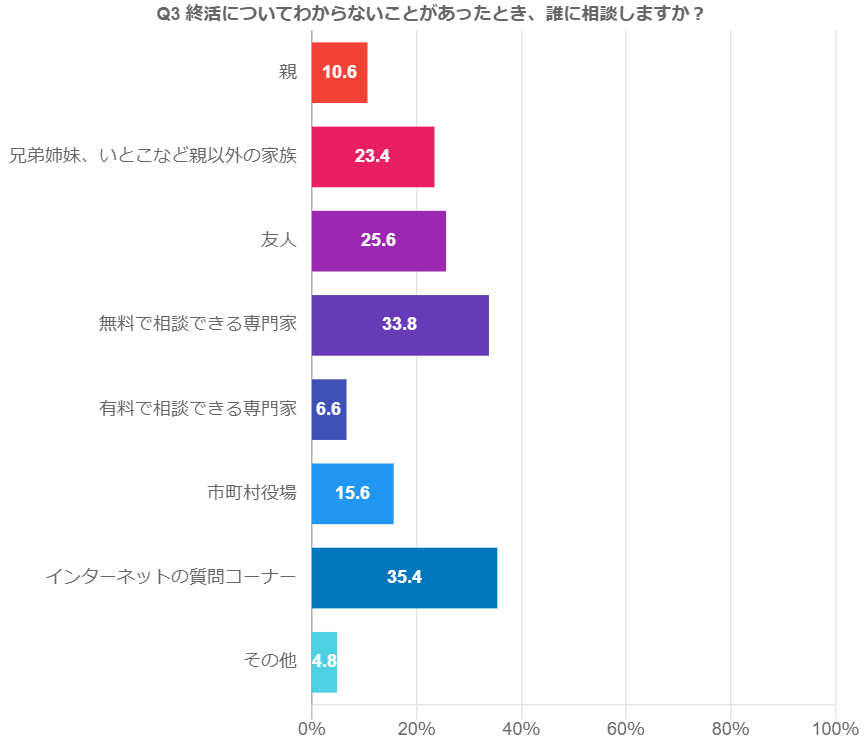 終活についてわからないことがあったとき、誰に相談しますか(複数回答形式)というアンケートの回答結果では、第一位が「インターネットの質問コーナー(35.4%)」で、時代を表すものとなりました。