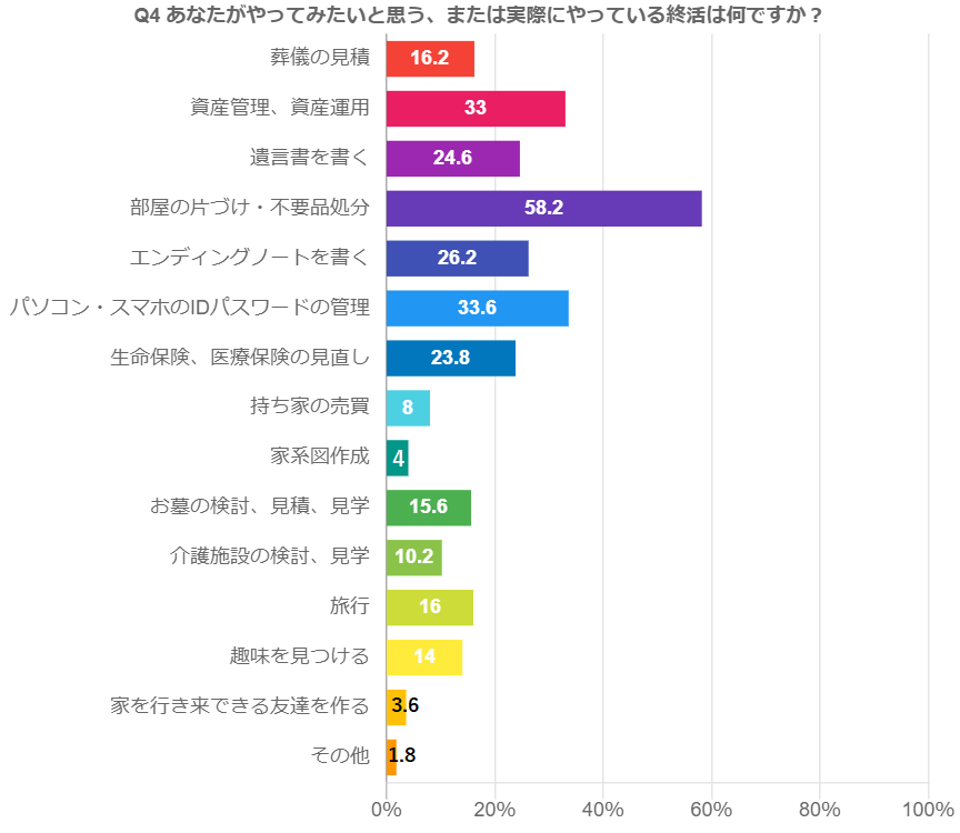 あなたがやってみたいと思う、または実際にやっている終活は何ですか(複式回答形式)というアンケートの回答結果では、第一位が「部屋の片づけ・不要品処分(58.2%)」、次いで「パソコン・スマホのIDパスワードの管理(33.6%)」と、現実的かつ現代的な結果となりました。