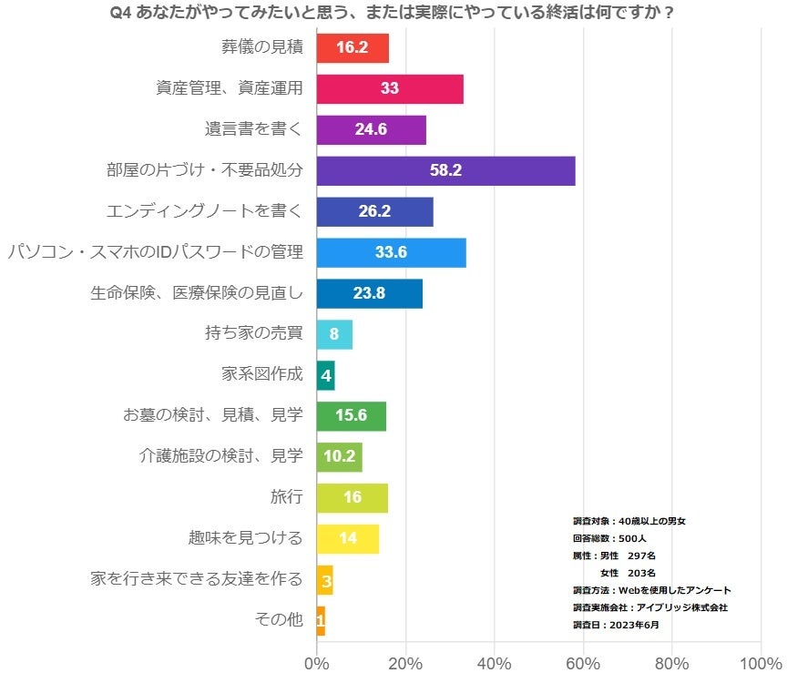 やってみたい、実際にやっている終活第一位は「部屋の片付け・不要品処分(58.2%)」、次いで「パソコン・スマホのIDパスワードの管理(33.6%)と現代的な結果に