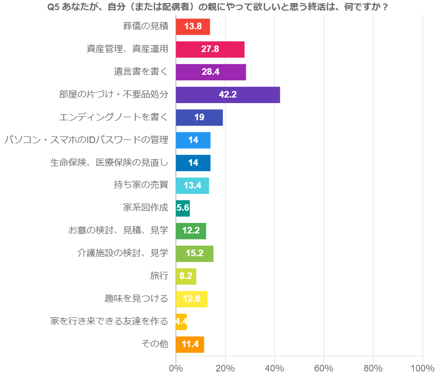 あなたが、自分(または配偶者)の親にやって欲しいと思う終活は何ですか(複数回答形式)というアンケートの回答結果では、第一位が「部屋の片づけ・不要品処分(42.2%)」と圧倒的な結果になりました。第二位は「遺言書を書く(28.4%)」、第三位は「資産管理、資産運用(27.8%)」です。