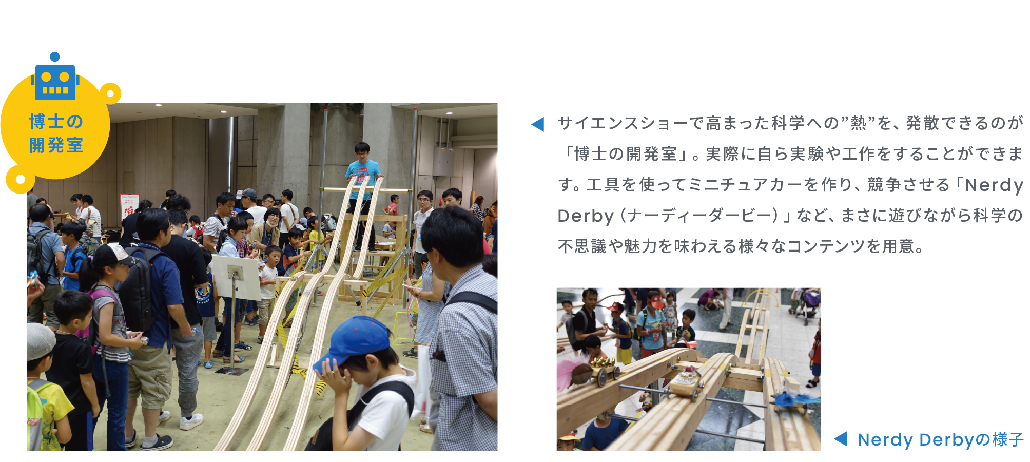 笑いと驚きが止まらないサイエンスショーや、遊びながら学べる科学実験などを通して、科学の楽しさを”どっぷり”体験できるメインエリアです。