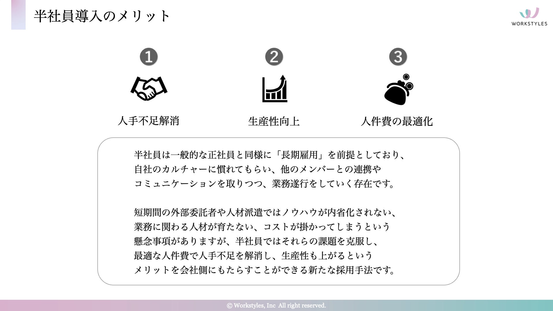 2つ目のメリットは「生産性の向上」です。半社員で働くという選択をされている方の多くは、時間的な制約を受けるため、短い時間のなかで課せられた業務を完了させなければならないという環境が生じます。その環境が結果的に半社員として勤務する社員のパフォーマンスを高めます。また副業・兼業スタイルで働く多様な人材の受け入れにより、自社以外の領域・業界で高めた専門的スキルを持った人材との協業が可能となります。